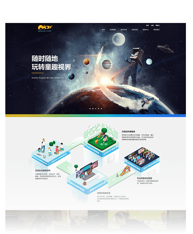 作為涉足虛擬現(xiàn)實(shí)領(lǐng)域針對(duì)兒童的產(chǎn)品,此首頁(yè)設(shè)計(jì)提案以體現(xiàn)姆姆寓樂(lè)專注兒童與虛擬互動(dòng)的科幻特性為主題,結(jié)合2.5D場(chǎng)景配圖設(shè)計(jì)手法,賦予頁(yè)面生動(dòng)形象的主題呈現(xiàn)效果。